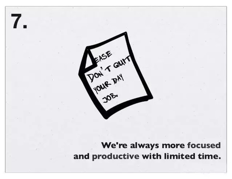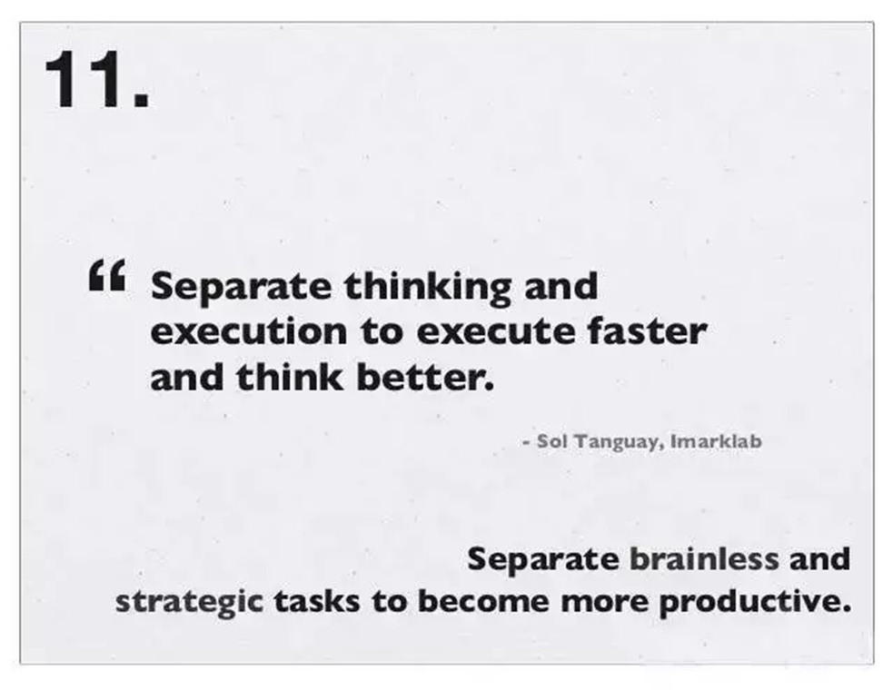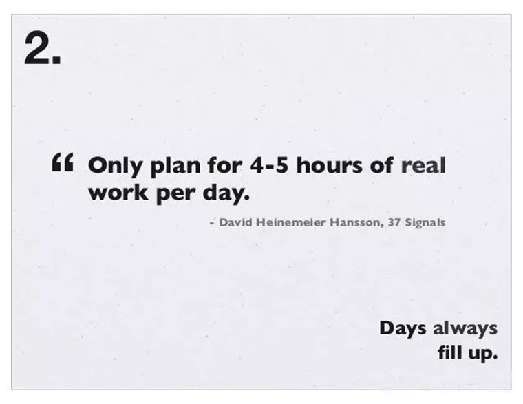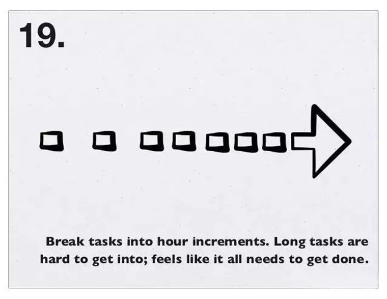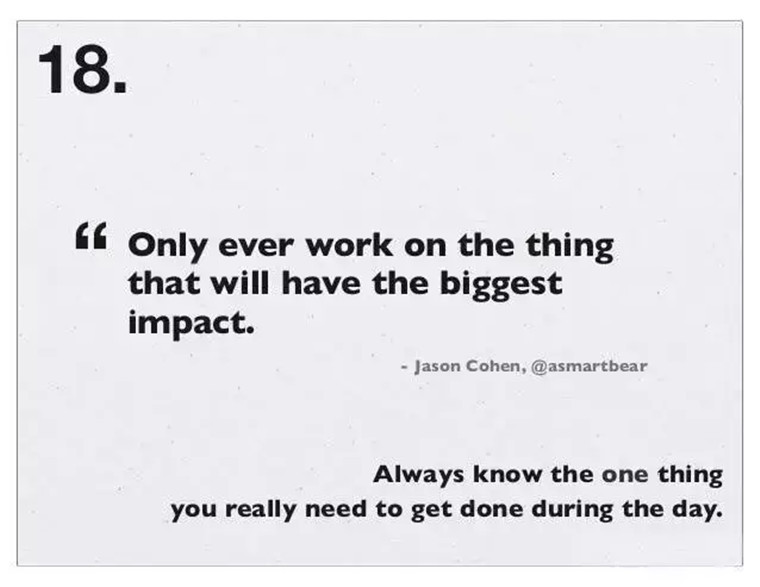 18、必需清晰白天必需完成的那件事,是什么。“Only ever work on the thing that will have the biggest impact” 只去做那件有着最大影响的事情。—— Jason Cohen