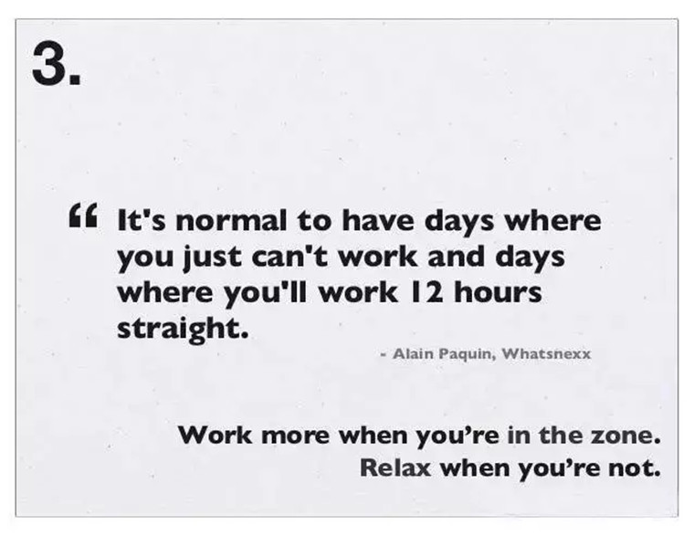 3、当你在状态时,就多干点;不然就好好休息:有时间会连着几天不是事情状态,有时在事情状态时却又能天天忙活 12 小时,这都很正常的。