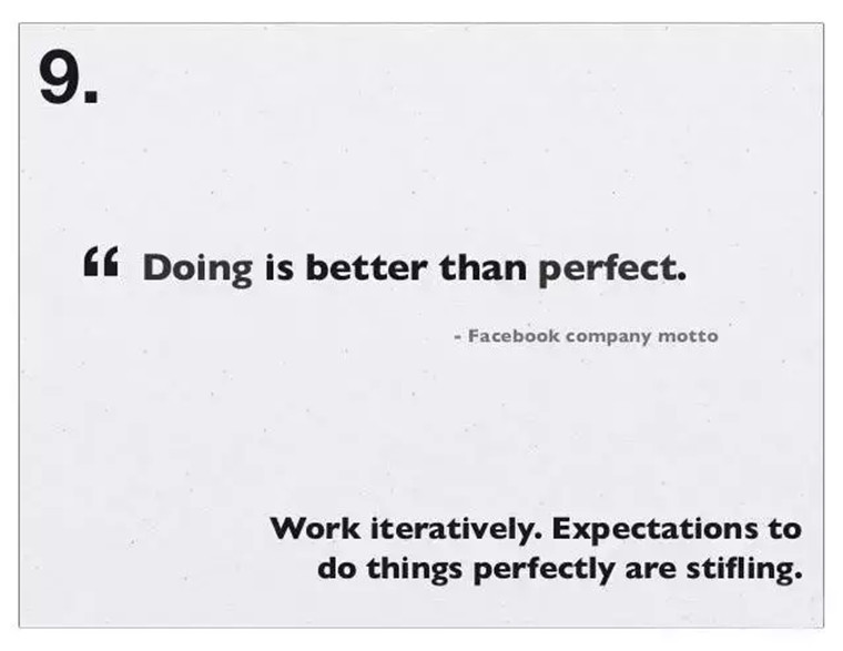 9、迭代事情,期待完善收工会令人窒息:“做完事情,要胜于完善收工” Facebook 办公室墙壁上贴的箴言。下手做,胜过任何完善的想象。