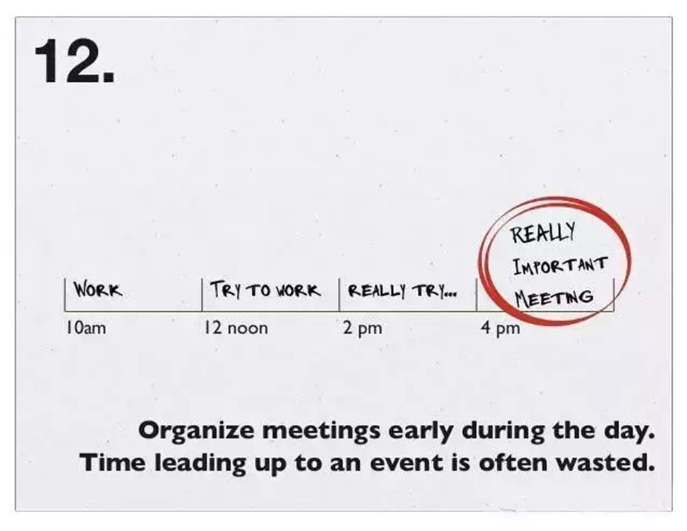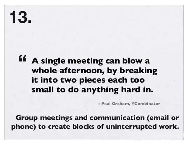 13、把聚会和相同 (邮件或电话) 团结,创立不中止事情时间:一个小会,也会毁了一个下昼,由于它会把下昼撕成两个较小的时间段,以至于啥也干不可。PS:当看到一个程序员冥思苦想时,不要已往打搅,甚至一句问候都是多余的。
