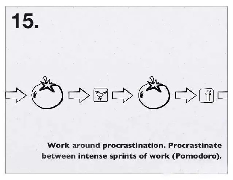 使用番茄事情法,选择一个待完成的使命,将番茄时间设为25分钟,专注事情,中途不允许做任何与该使命无关的事,直到番茄时钟响起,然后在纸上画一个X短暂休息一下(5分钟就行),每4个番茄时段多休息一会儿。