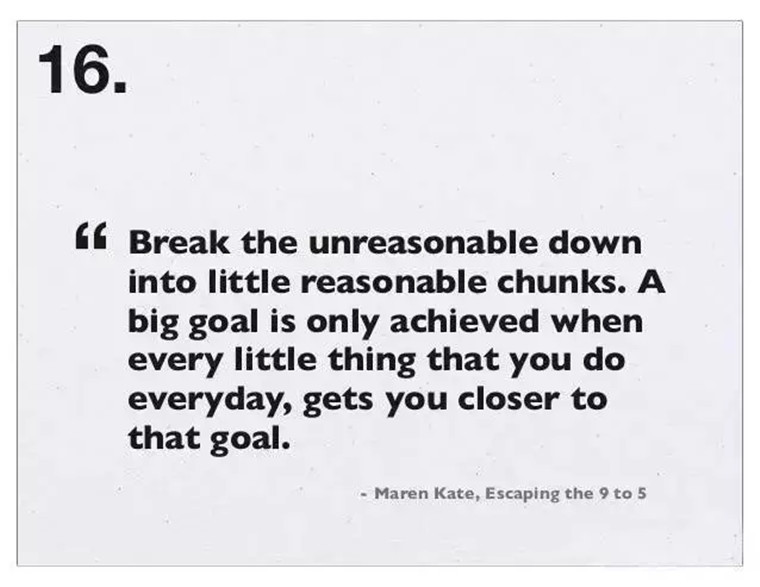 16、把不切现实的使命支解成合理的小使命,只要天天都完成小使命,你就会越来越靠近谁人大目的了。