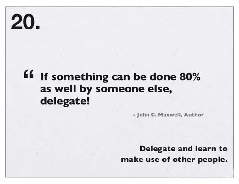 20、授权并擅用他人的实力。—君子善假于物(人)也,若是某件事其他人也可以做到八成,那就给他做!