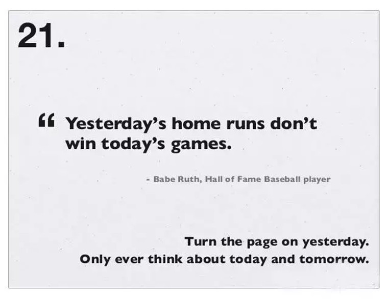 21、把昨天翻已往,只思量今天和明天。昨天的全垒打赢不了今天的角逐。—英雄不提昔时勇。