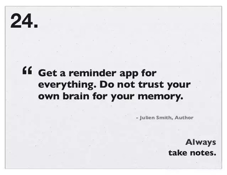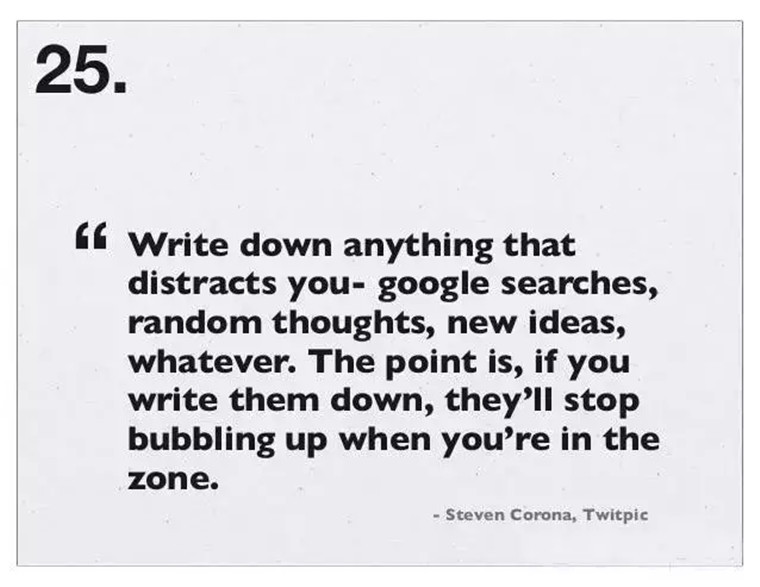 25、进入高效状态后,记下任何疏散你注重力的工具好比Google搜索词、灵光乍现的想法、新点子等等。若是你把它们记下来,它就不会再蹦来蹦去了。