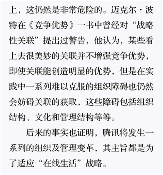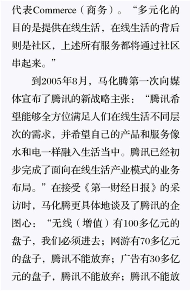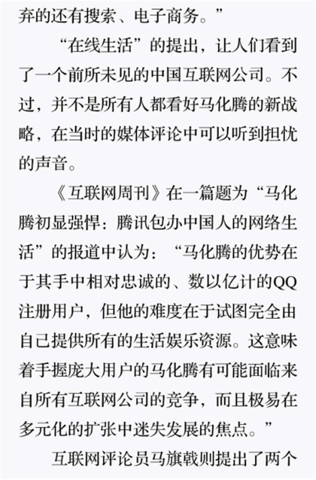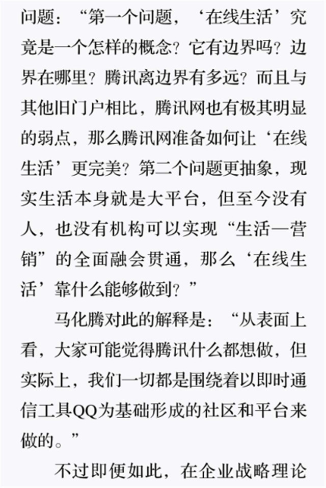 深读之后发明,着实全书真正的焦点在于透过腾讯可以视察到的中国企业逻辑,其中许多基于国情而降生的特殊能力,已往或受诟病或被追捧,而本书作者可以以越发客观的姿态对其举行剖析,这无疑是一种今世创业者和企业家应当学习的姿态和能力 。