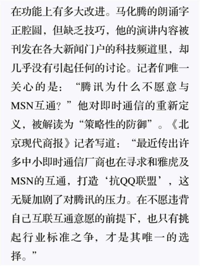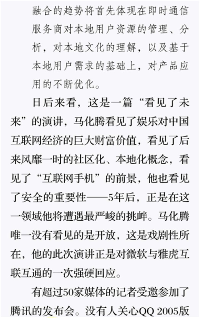 深读之后发明,着实全书真正的焦点在于透过腾讯可以视察到的中国企业逻辑,其中许多基于国情而降生的特殊能力,已往或受诟病或被追捧,而本书作者可以以越发客观的姿态对其举行剖析,这无疑是一种今世创业者和企业家应当学习的姿态和能力。
