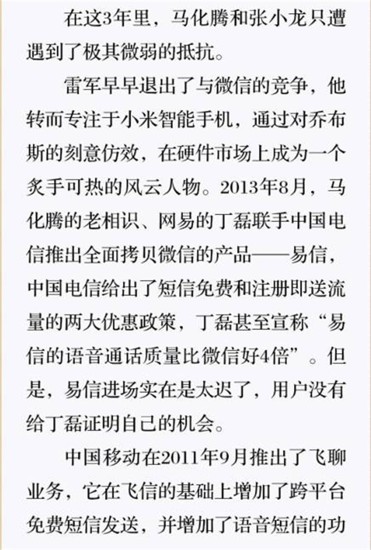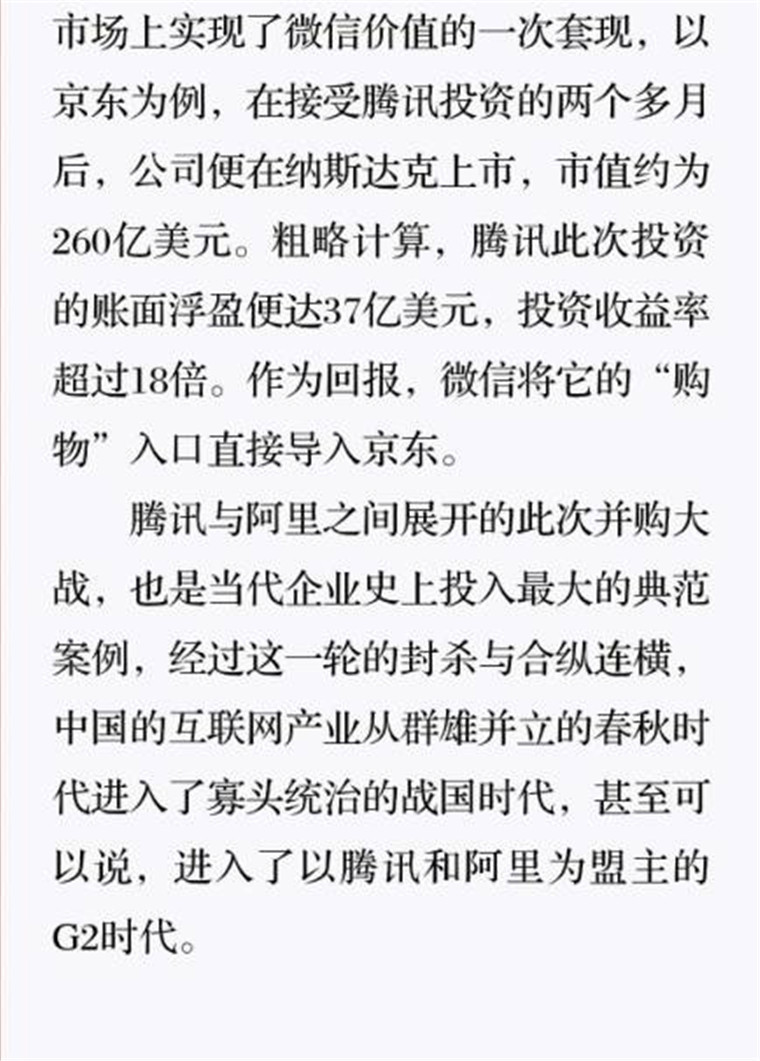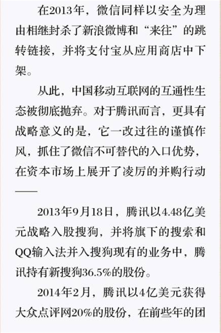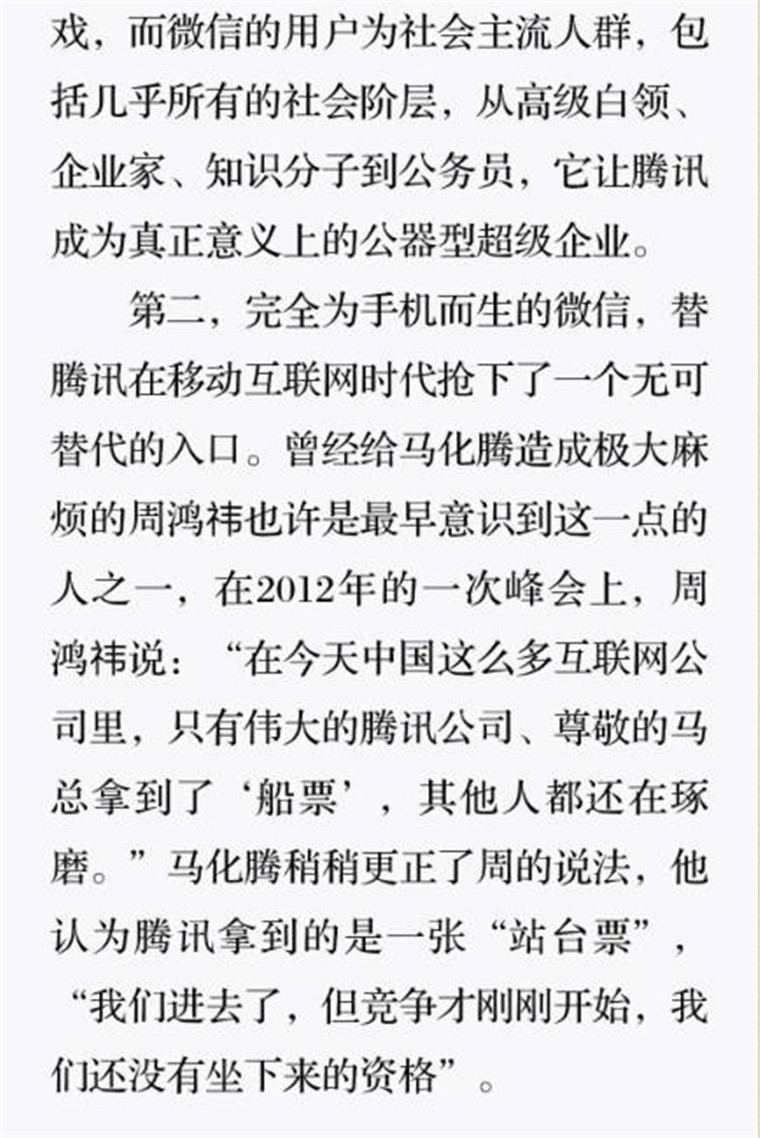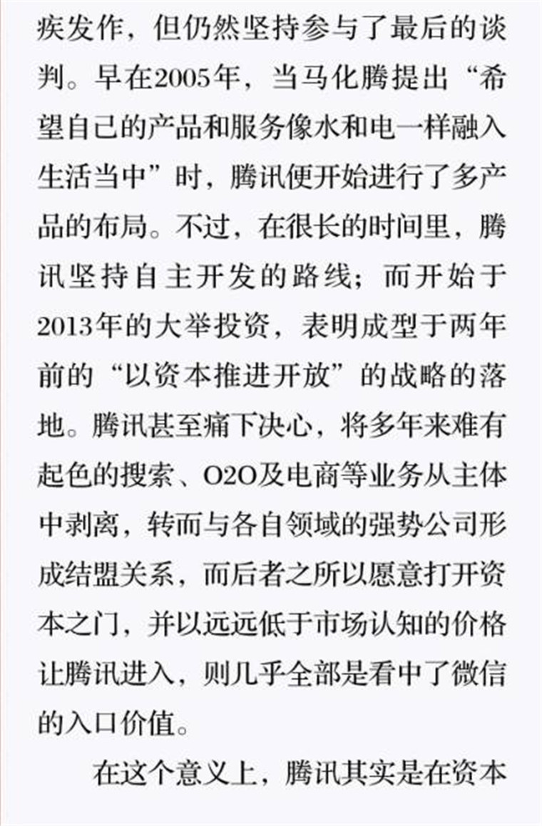 深读之后发明,着实全书真正的焦点在于透过腾讯可以视察到的中国企业逻辑,其中许多基于国情而降生的特殊能力,已往或受诟病或被追捧,而本书作者可以以越发客观的姿态对其举行剖析,这无疑是一种今世创业者和企业家应当学习的姿态和能力。